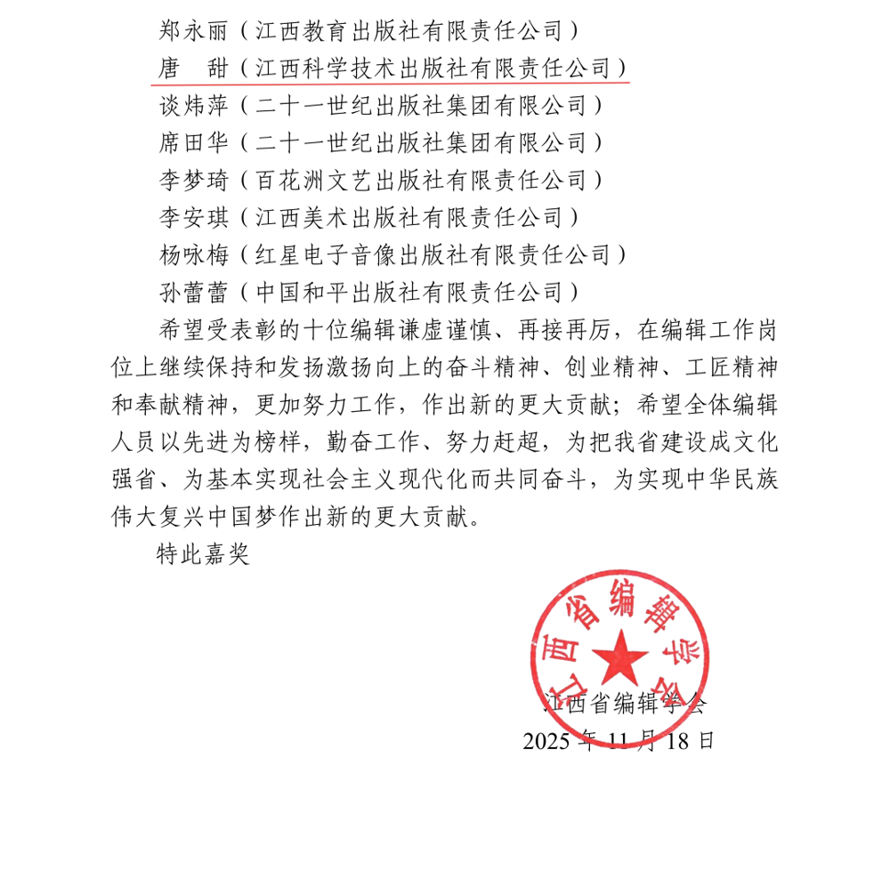 近日,第四届“江西省编辑学会十佳编辑”表彰决定正式公布,我社唐甜同志被授予“江西省编辑学会十佳编辑”荣誉称号。